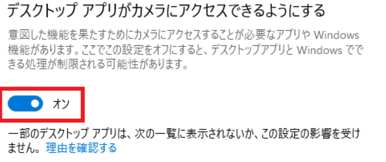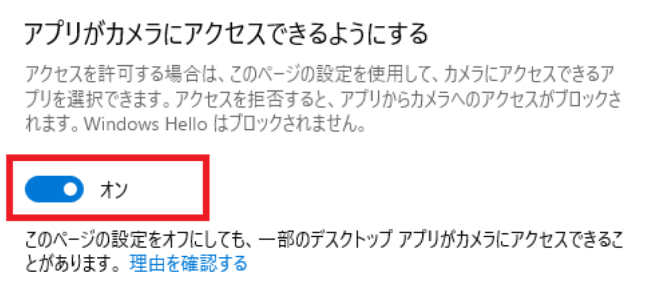 「デスクトップアプリがカメラにアクセスできるようにする」をオンにして完了です。