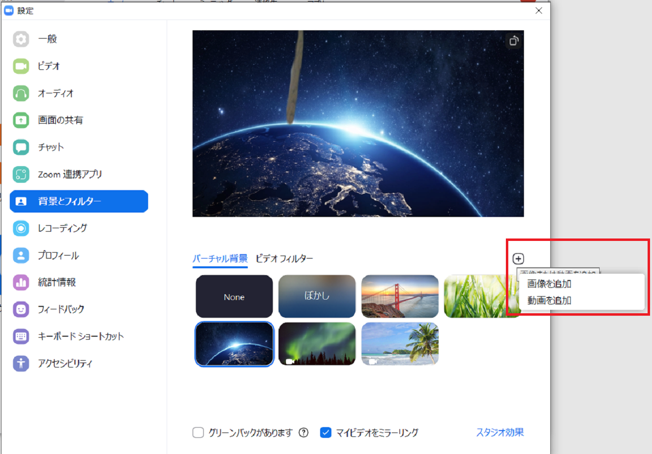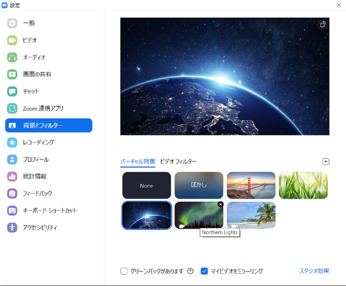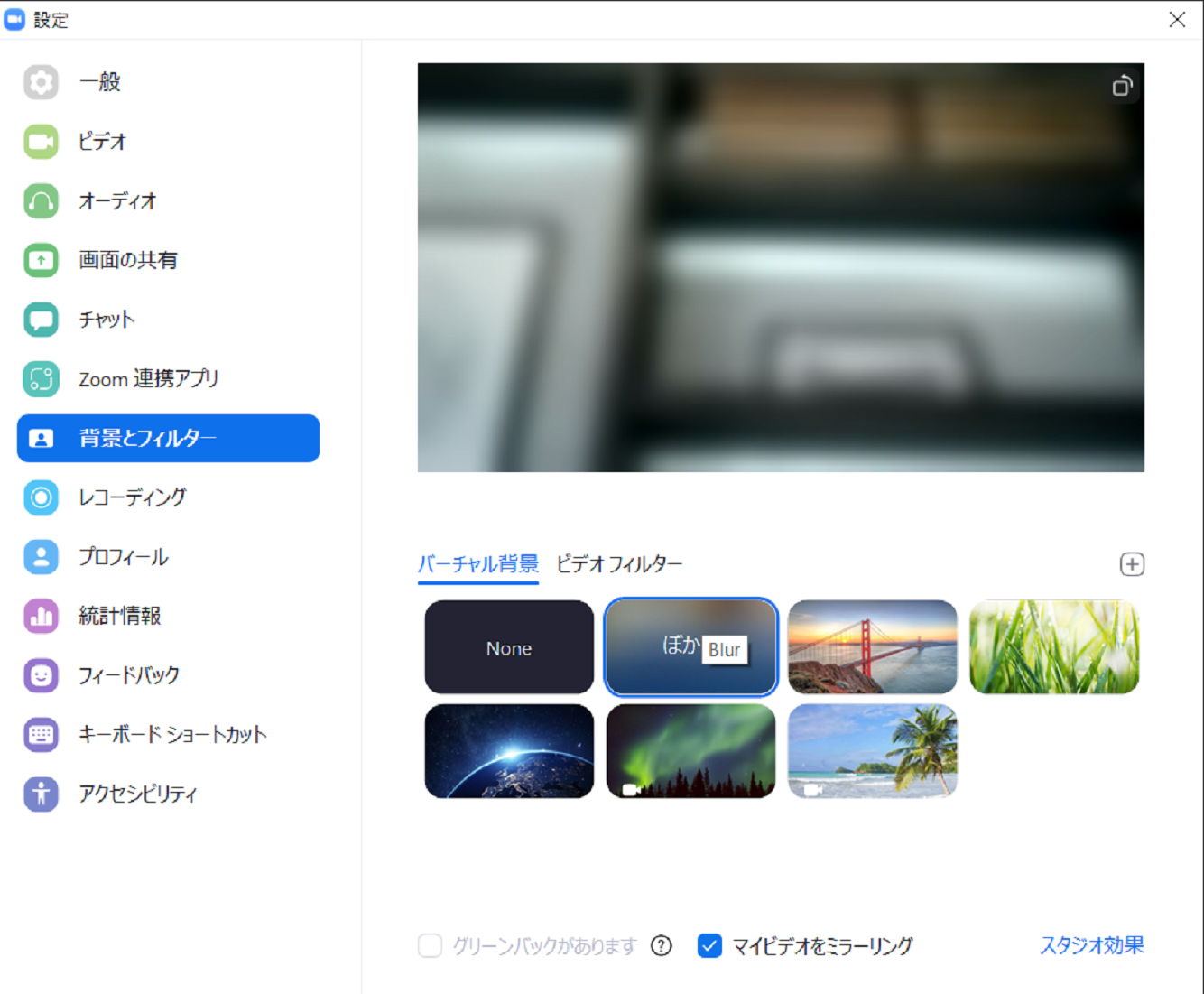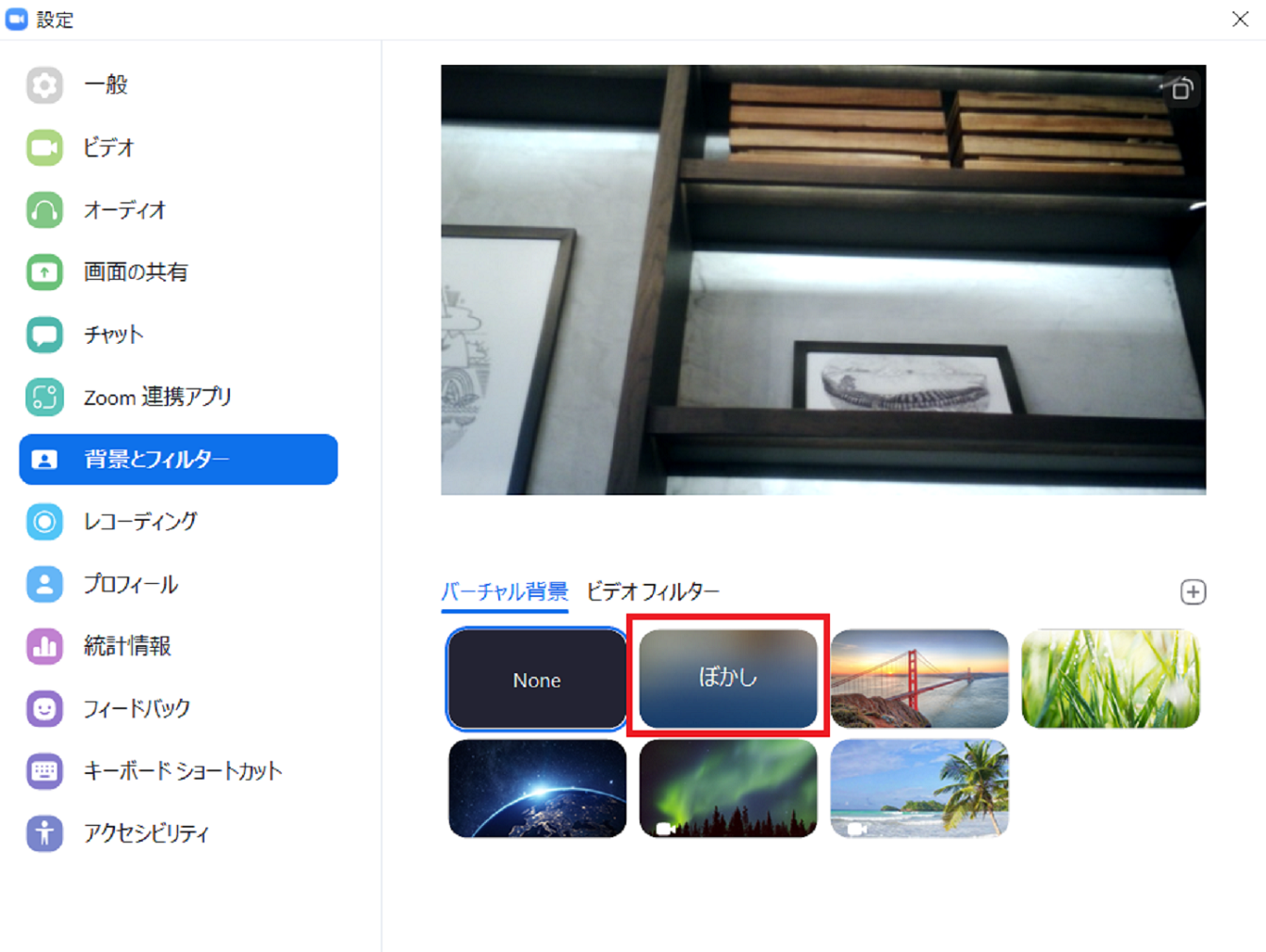 先ほどは「ぼかし」を選びましたが、ここでバーチャル背景を選ぶと設定が完了します。