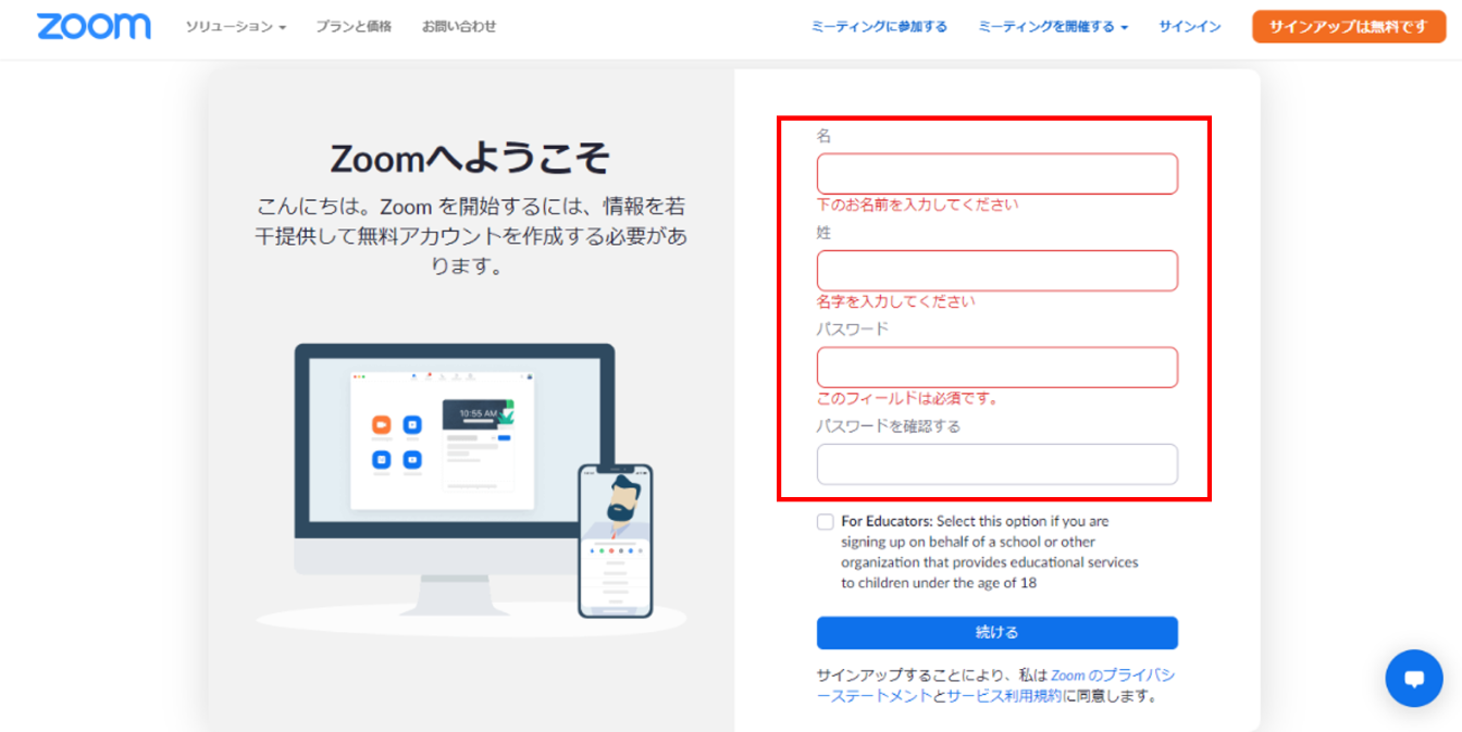 上記画面に移るので、名前、パスワードを入力し、「続ける」をクリックします。