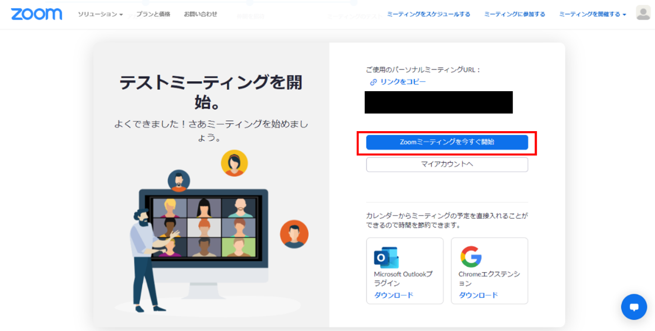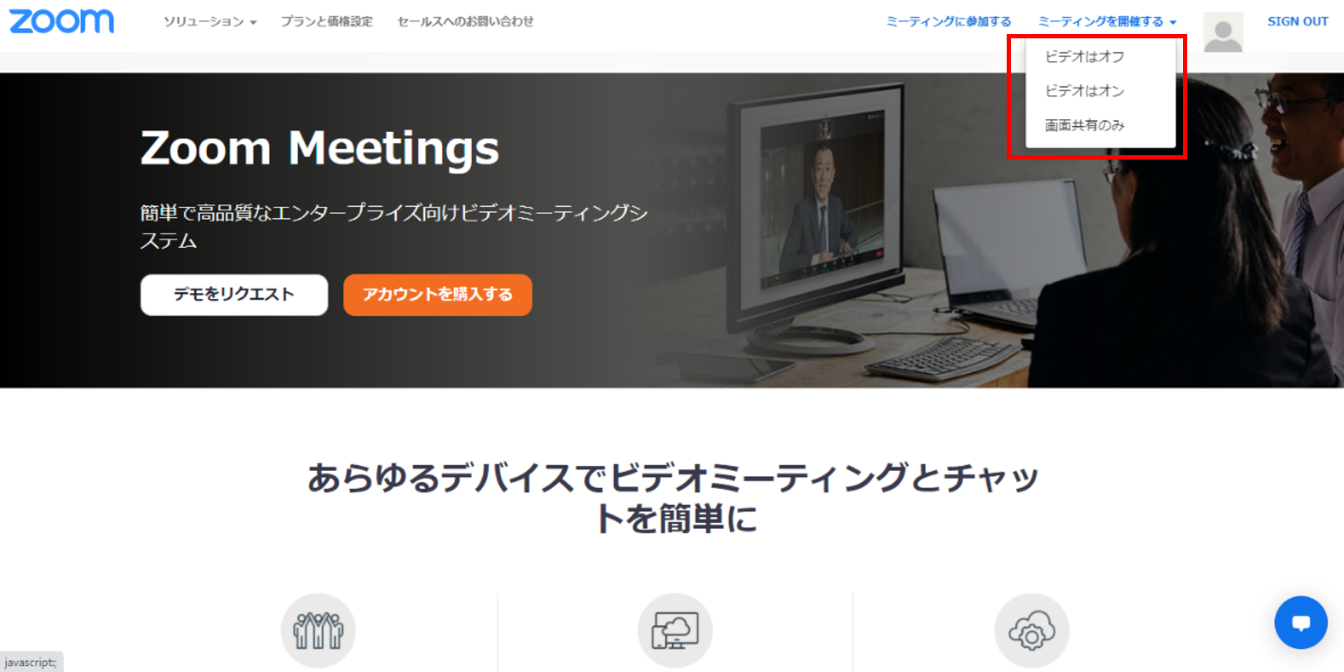 「Zoom」にアクセスし、「ミーティングを開催する」をクリックします。