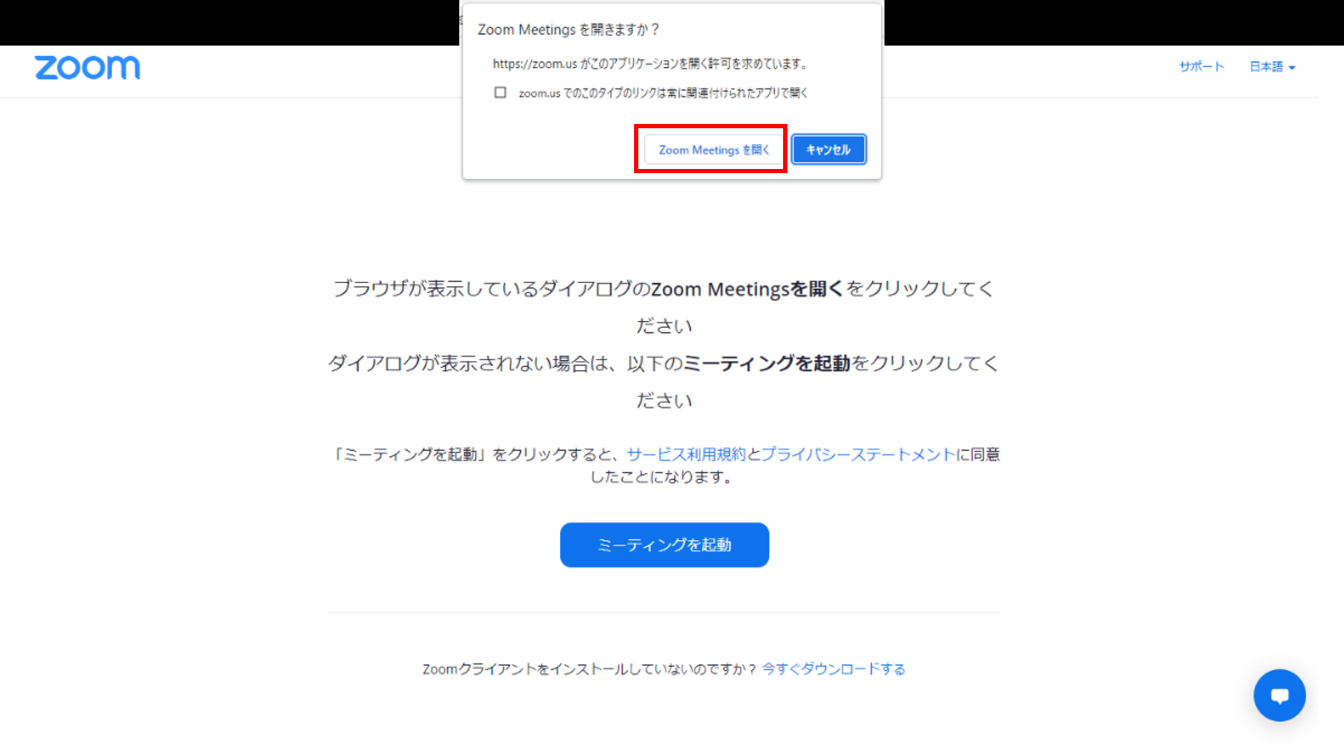 上記の画面に切り替わるので、「Zoom Meetingを開く」をクリックします。