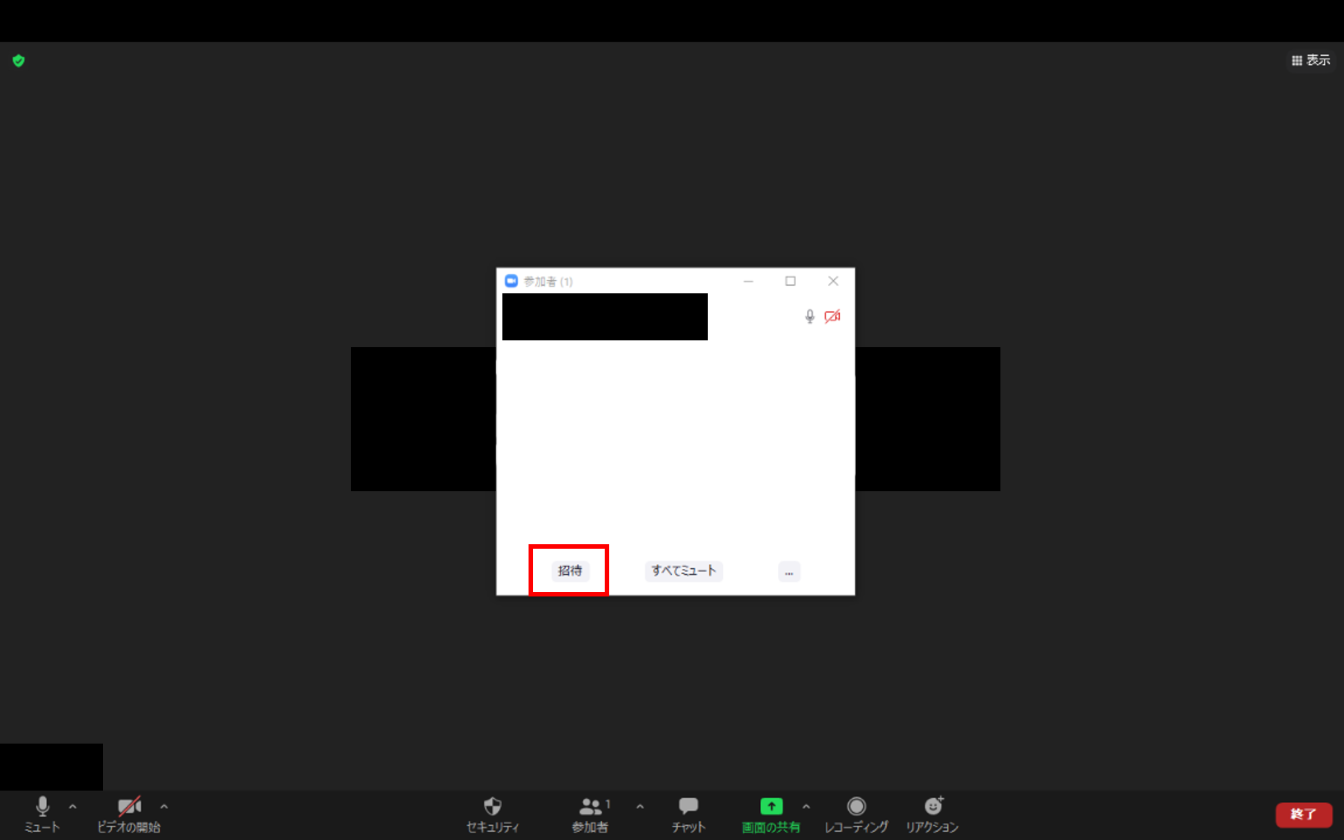 オンライン会議画面となったら、下のバーにある「参加者」をクリックすると、上記画面となるので、「招待」をクリックします。