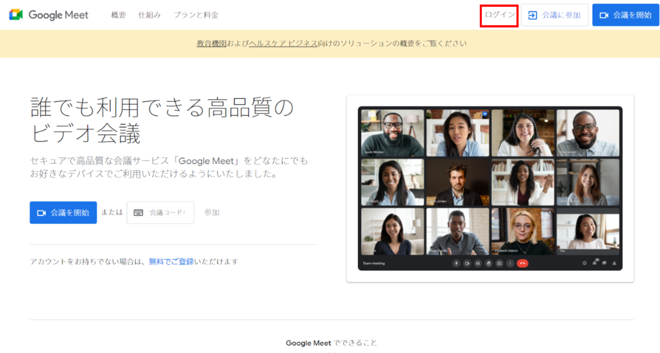 まず「Google Meet」にアクセスすると、上記画面になるので、右上のログインをクリックします。