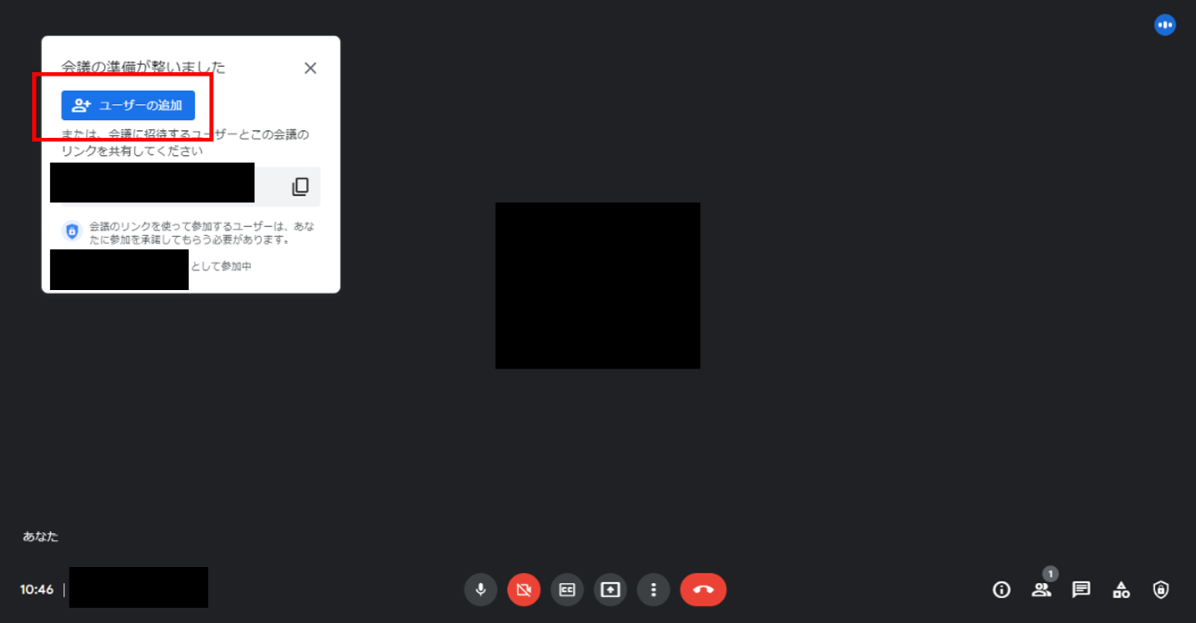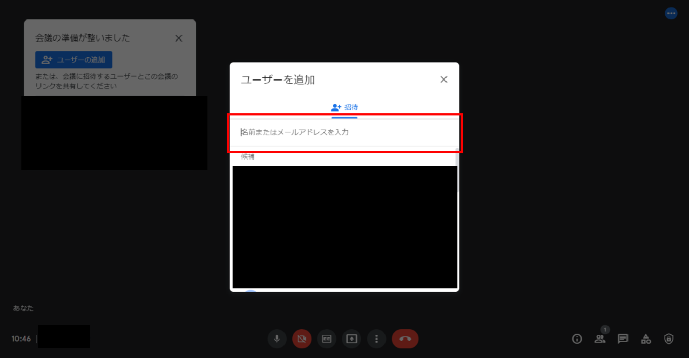 オンライン会議画面に移行するので、「ユーザーの追加」をクリックし、メールアドレスを入力すると、Gmailでリンクを参加者に送付できます。