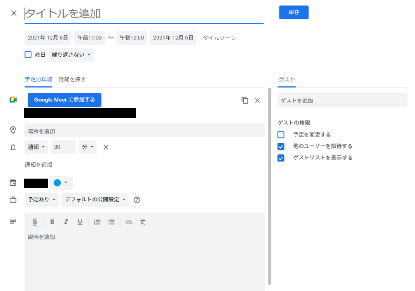 上記画面となるので、必要事項を入力すると、参加者含め、Googleカレンダーに予定を簡単に入れることができます。