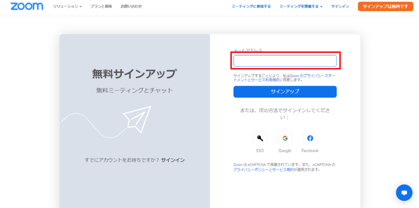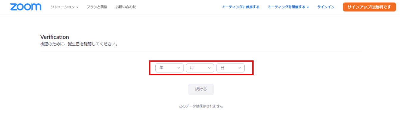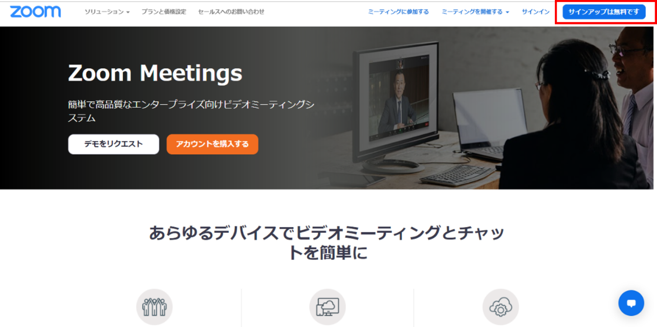 まずは「Zoom」にアクセスすると上記画面になるので、右上の「サインアップは無料です」をクリックします。