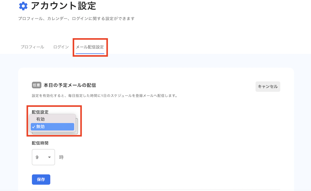配信をする場合は、「メール配信設定」を選択して、配信設定を有効にします。また、配信時間を任意に設定することができます。