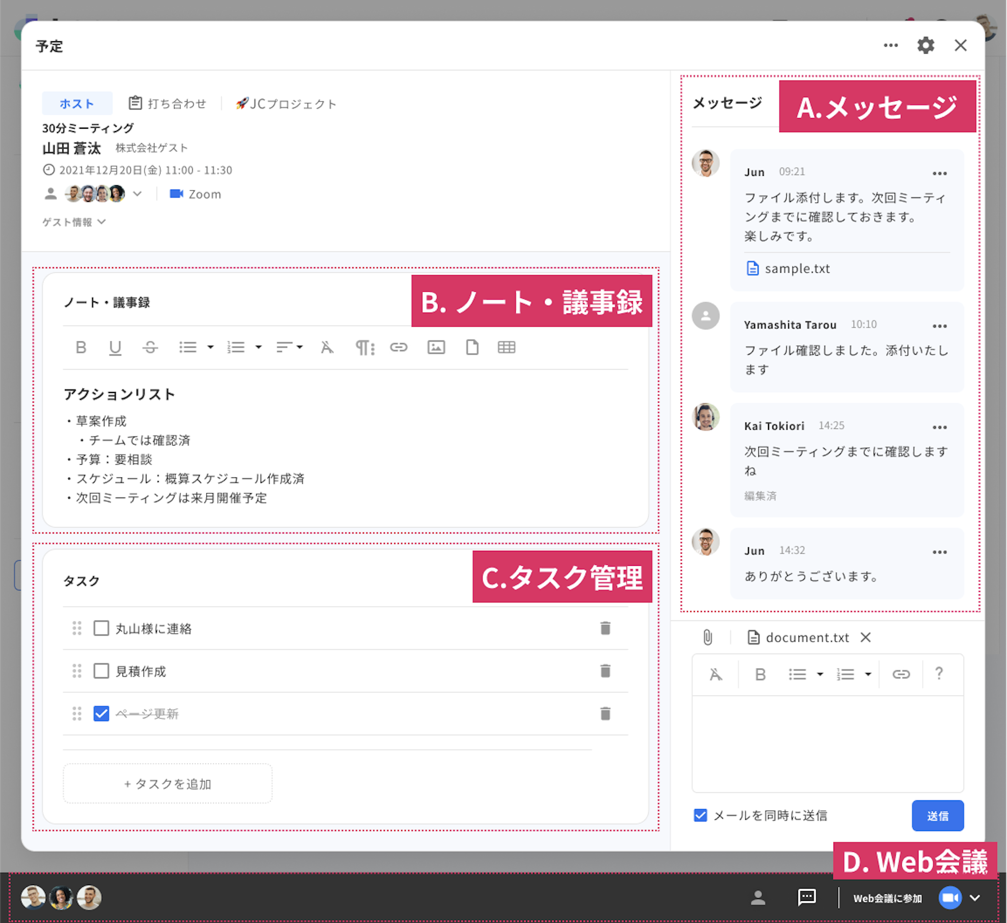 A.メッセージ:チームメンバー・ゲストとのメッセージを予定詳細ページ上で行うことができます。また、メッセージは同時にメールで送信することができ、ファイルの添付も可能です。