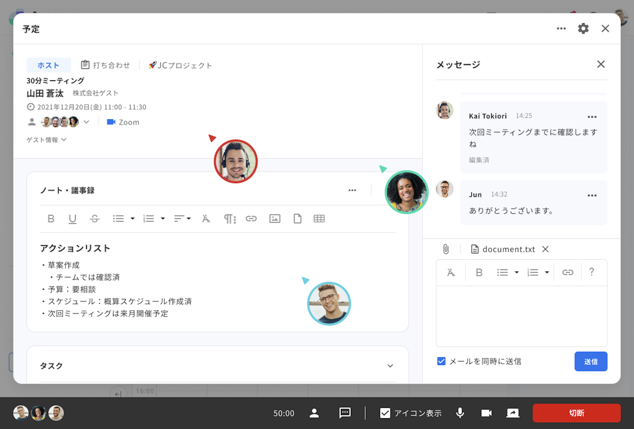 予定詳細ページではメッセージ、議事録、タスク管理、Web会議までミーティングに必要な情報を一元管理することができます。この機能によりチームメンバーやゲストとスムーズなミーティングの開催が可能となっています。